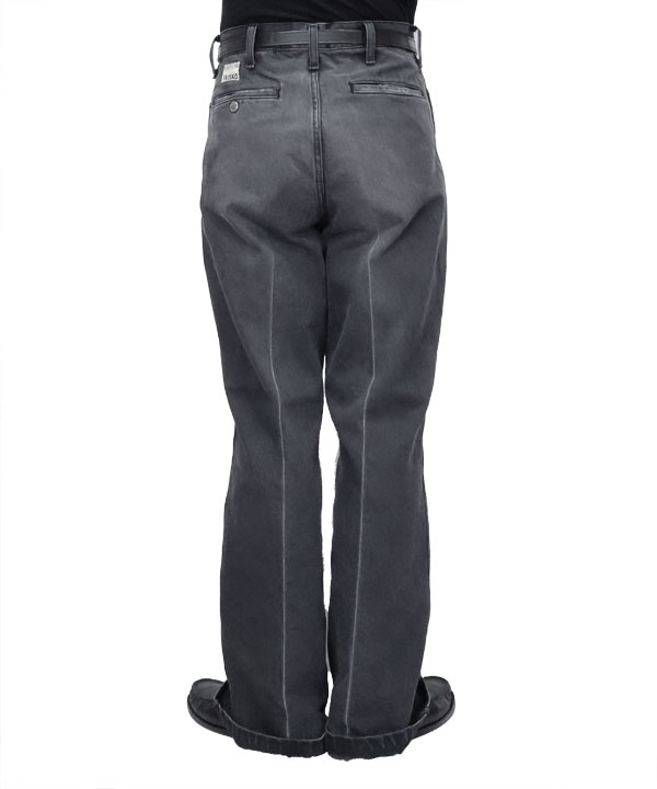 14ozブラック×ブラックデニム 5P フリスコ(センタープリーツ加工)14オンスデニム生地を使用するLポケ5ポケットのフリスコデニム。人気アイテム!フレアシルエットで加工も施され、センタープリーツ加工のラインが入ります。カラー:ブラック加工