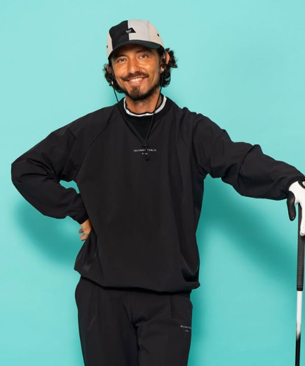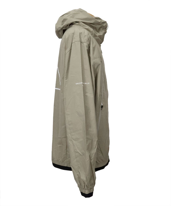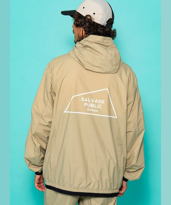 左胸ZIPテープにNALU&TURFのプリントが入り、右袖にSALVAGE PUBLIC Kolepaスタンプロゴのプリント入り。