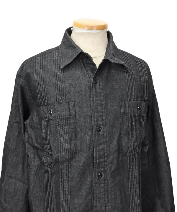 特徴的なキューバシャツのピンタックとチンストラップ付きの台衿、胸パッチポケットなどワークシャツのディティールをミックス。