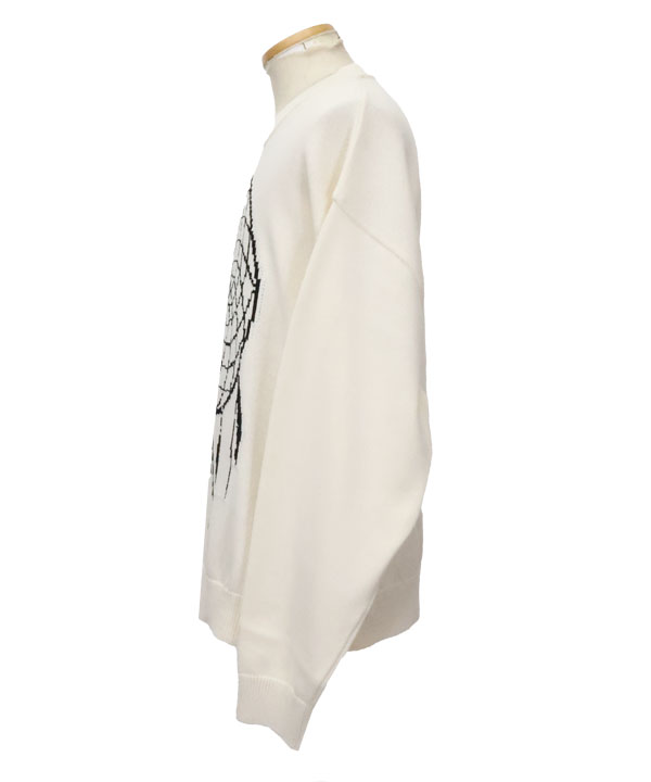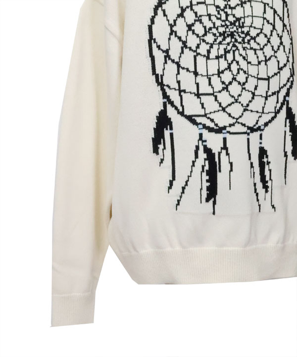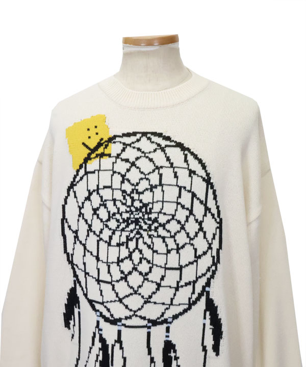 7Gニット PECKISH ドリームキャッチャー クルーセーター7ゲージで仕立てられたBIGシルエットのクルーネックニット。胸元にはPECKISH と悪夢を捕らえて良い夢だけを届けてくれる伝統的なお守りドリームキャッチャーを程こした素敵な一枚。ポリエステル×コットン×アクリル素材。薄手で柔らかな生地感、着心地の良さもご体感ください。1サイズと3サイズの展開アイテムカラー:キナリ