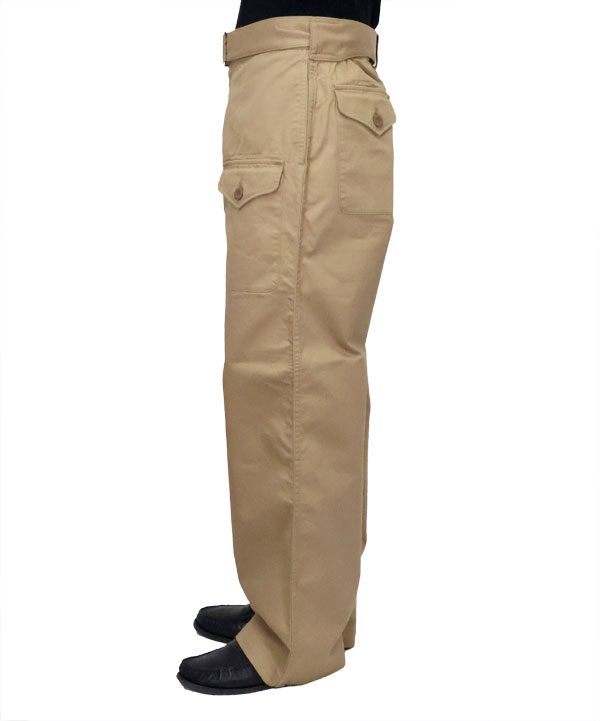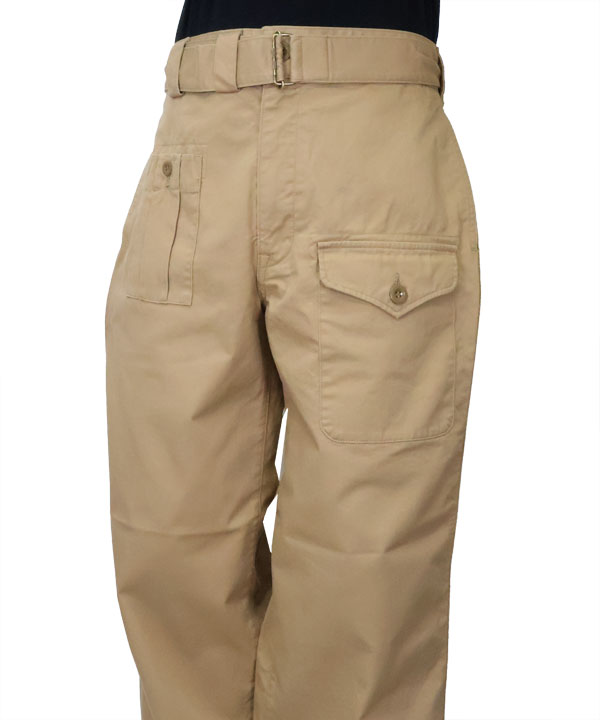 フレンチアーミーのモーターサイクルパンツの特徴的な共地ベルト仕様とブリティッシュアーミーのオーバーパンツのフロントのポケット仕様を掛けあわせたミリタリーパンツ。