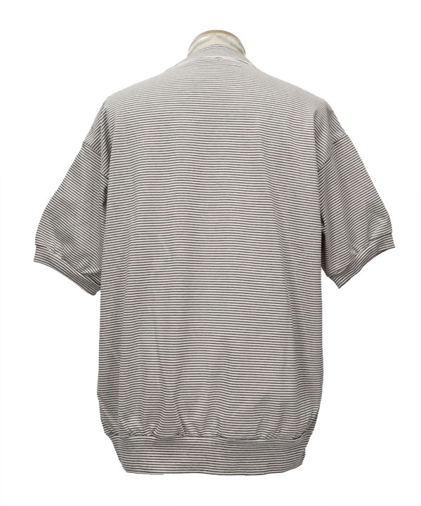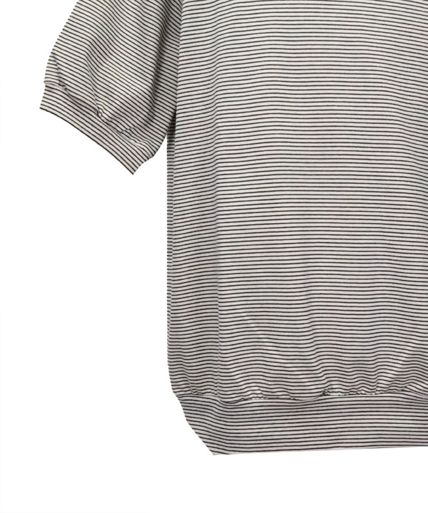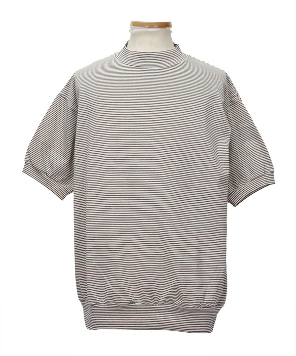 細ピッチのオリジナルボーダー天竺を使用した半袖スウェットデザインのモックネックTEEです。