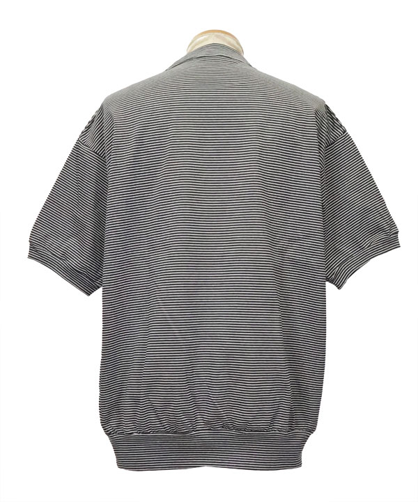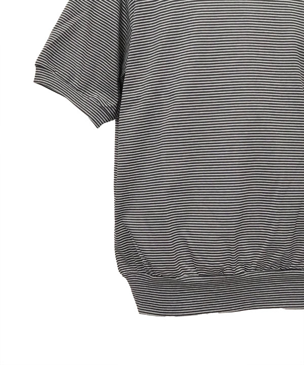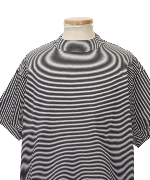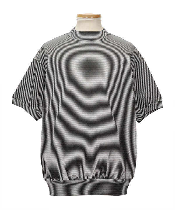 細ピッチのオリジナルボーダー天竺を使用した半袖スウェットデザインのモックネックTEEです。