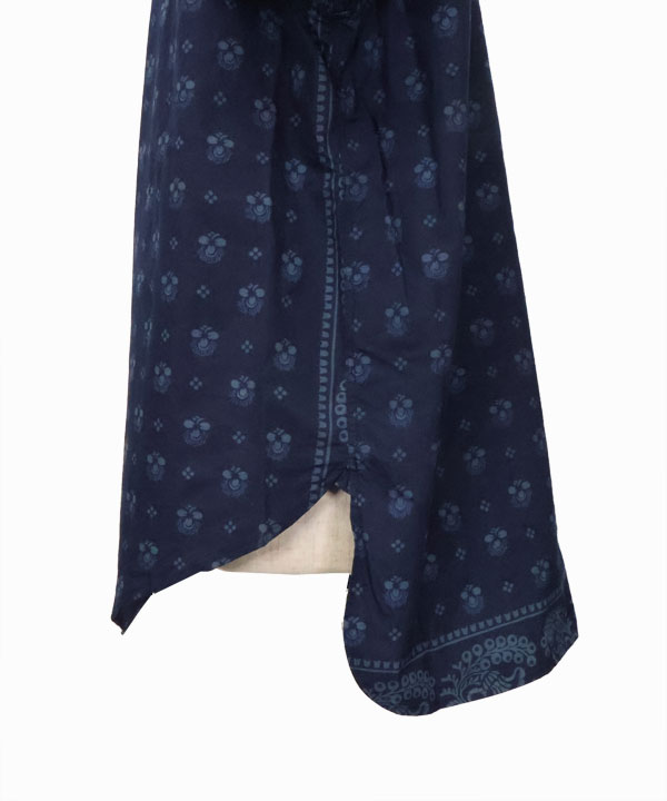 当時のようなインディゴの色目に深みを持たせる為、可抜染料で下染めし、インディゴ染めを重ねオートスクリーンでは出来ない100cmの柄を2枚で手捺染(ハンドスクリーン捺染)大版プリントを施しました。