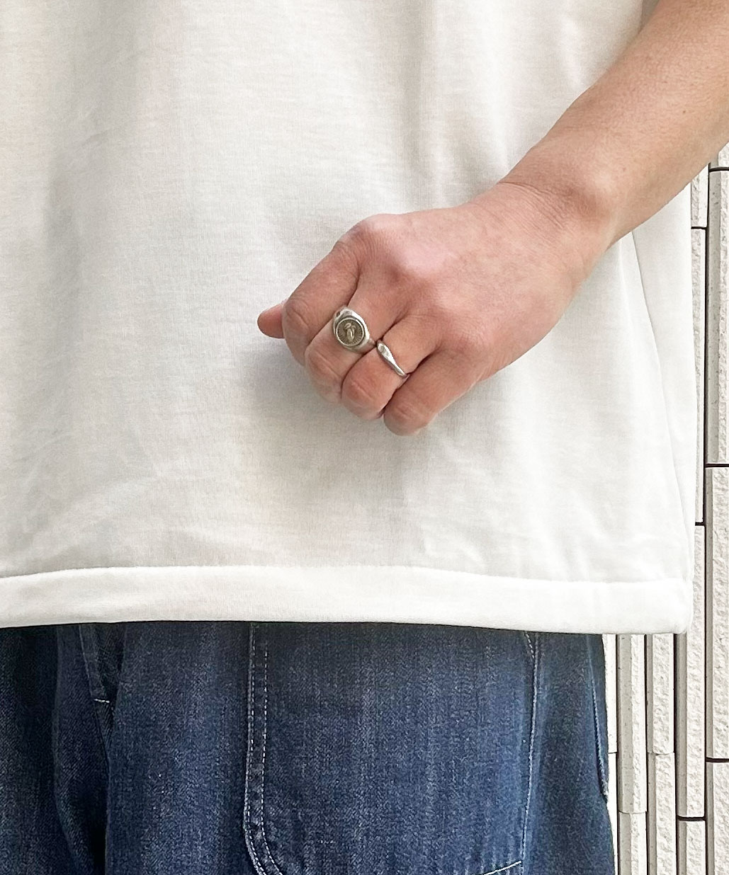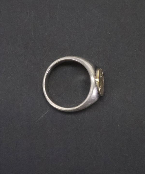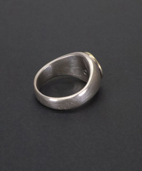 HAND リング"祈りの手" のデザインのブラス製メダイをトップに施した印台リング(シグネットリング)です。ベースのシルバー部分には銀製品を表すライオンホールマークが打刻されています。自分の想いを込めて、お守りとして愛用できる作品です。VR-HAND綾野剛さん着用モデルサイズ:22号素材:シルバー925+ブラス最大幅:14.5mm程度