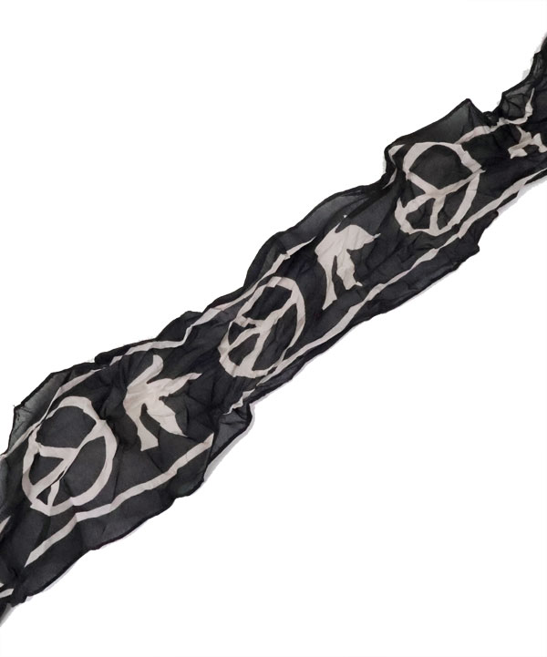 ワッシャーシルク モガスカーフ(LIVE PEACE)PEACE柄が程こされた長めのスカーフ。シルクをウォッシュしております。首元のワンポイントにお使いください。ワンサイズ展開長さ:175㎝