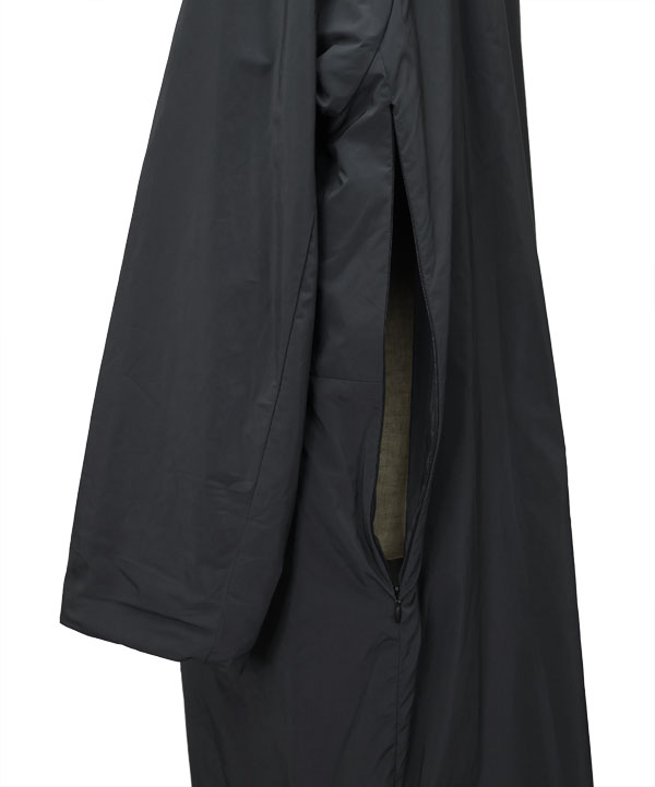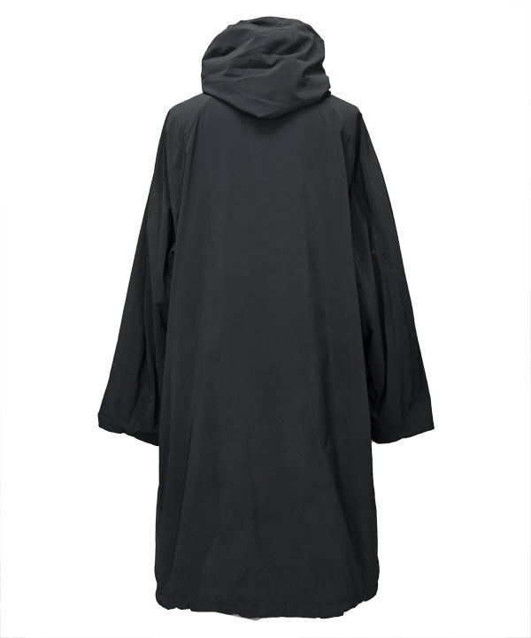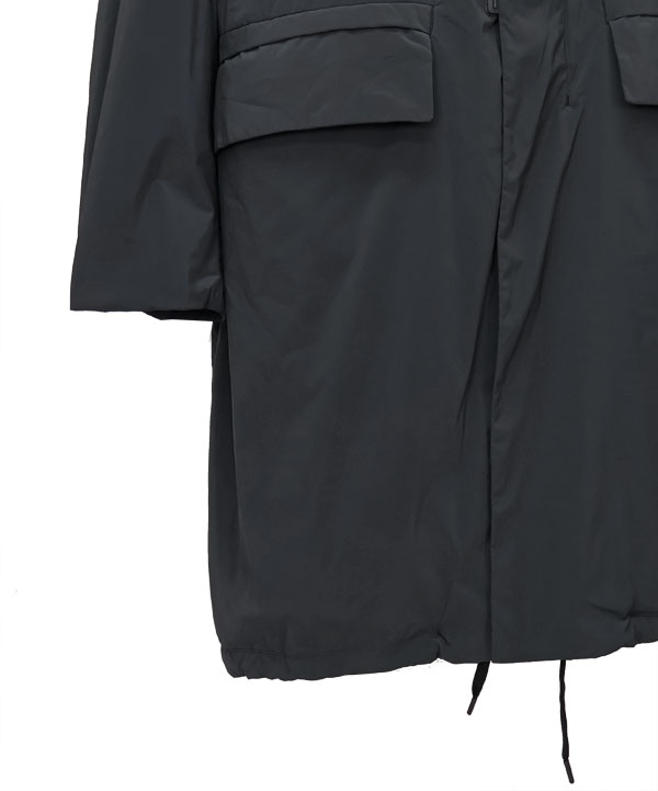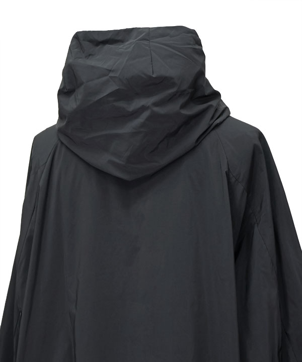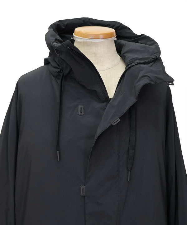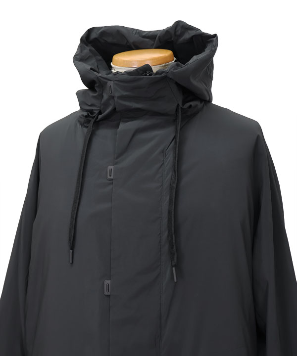 広めの身幅と長めの着丈でシルエットに特徴を持たせたフード付ロングコート。アームホール部分にボリュームを持たせたシルエットとなっています。