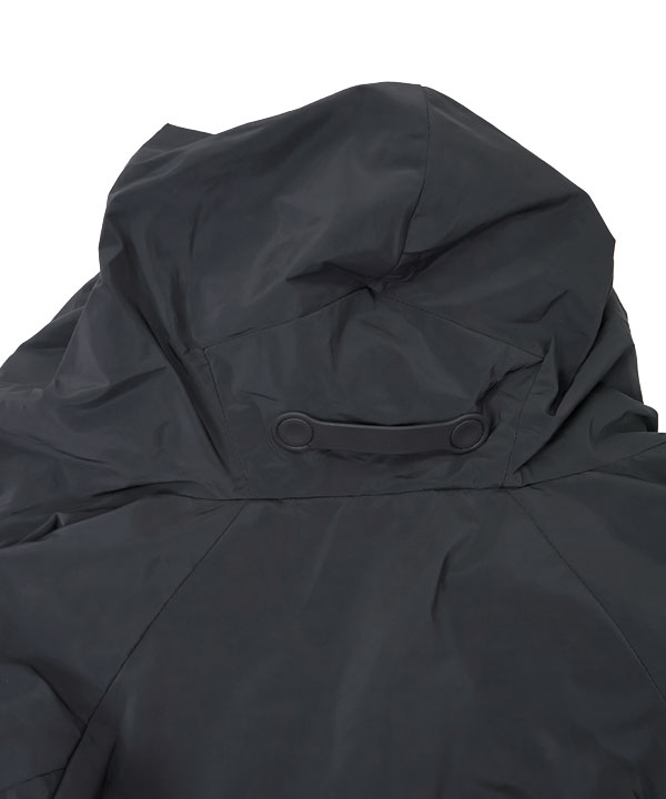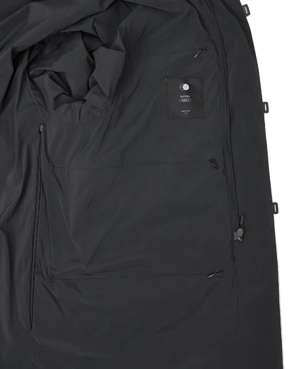 また、フロントはフックとファスナーの比翼仕様で、高温・低温にも強く、水もはじき、劣化しにくい”TEATORA”オリジナルフック(樹脂性)が付属します。そして襟後にもラバー製のオリジナルハンガーフックも施されています。